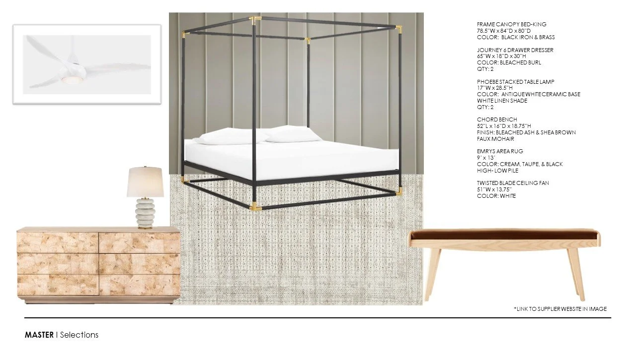 The homeowners created a master suite during construction so that they had some more privacy in this smaller home. The client’s only request for the master was to have a canopy bed, but the bed will be placed in front of two windows. So that the windows weren’t too obstructed by this, a low profile frame was chosen.